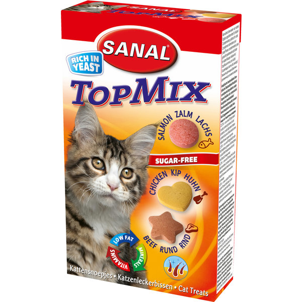 * Mix van zalm rondjes, kip hartjes en rundvlees sterretjes. * Rijk aan gist met vitamine B1, B2, B6 en B12. * Voor een gezonde en glanzende vacht. * Met calcium voor sterke botten en tanden. Sanal TopMix is een lekkere en gezonde traktatie voor je kat. Vitamine B1, B2, B6 en B12 in de speciale hoogwaardige gist zorgen voor een gezonde en glanzende vacht. Calcium helpt tanden en botten sterk te houden. Laag vetgehalte.