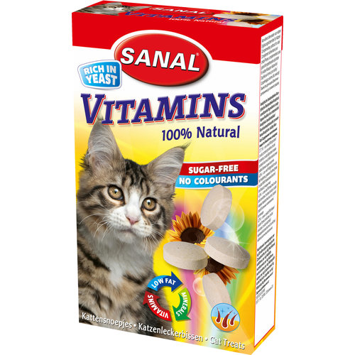 * Rijk aan gist met vitamine B1, B2, B6 en B12. * Voor een gezonde en glanzende vacht. * Met calcium voor sterke botten en tanden. Sanal Vitamins is een lekkere en gezonde traktatie voor uw kat. Vitamine B1, B2, B6 en B12 in de speciale hoogwaardige gist voor een gezonde en glanzende vacht. Calcium helpt tanden en botten sterk te houden. Mineralen helpen het natuurlijke afweersysteem te versterken. Bevat geen kleurstoffen en is suikervrij.