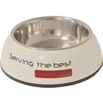 Witte honden eet- of drinkbak met de tekst "Serving the best - Fashion Club". Deze voerbak is gemaakt van plastic met een RVS eet- of drinkbak. De voerbak is voorzien van een anti-slip rand. Verkrijgbaar in verschillende maten en kleuren....Meer informatie