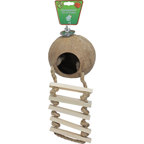 De kokosnoot met touwladder is een leuk kokosnoothuisje voor parkieten met een laddertje. U kunt de kokosnoot vullen met smakelijke snacks, fruit of groente. Dit tropische huisje is door middel van de schroefdraad gemakkelijk op te hangen in een vogelkooi of volière.