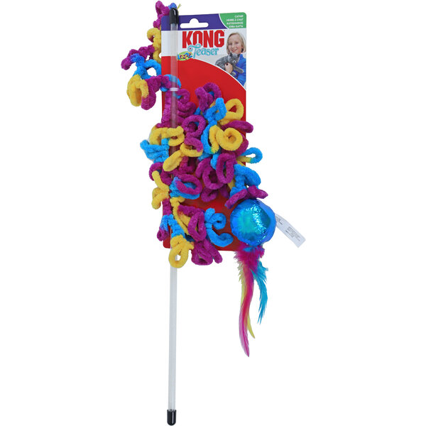 De Kong Teaser loopz heeft een extra lange hengel en zachte ringen die het jachtinstinct van uw kat stimuleren. De ringen dagen uw kat uit om te gaan spelen. De glanzende bal en fladderende veertjes bieden uw kat een spannend visueel doel om te bespringen, terwijl de knettergeluidjes van de bal katten geïnteresseerd houden. Het Kong North American premium catnip in de bal maakt uw kat enthousiast, waardoor het speelplezier nog groter wordt.