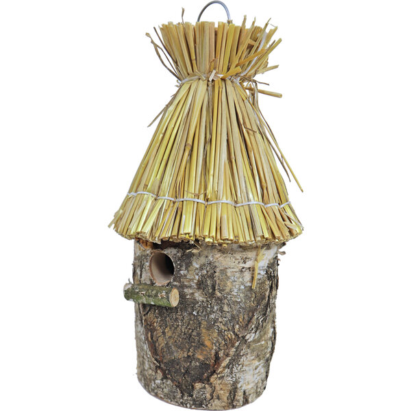 In- en uitvliegopening: Ø 30 mm. Mezenkast berken met stro dak hangbaar, puur natuurlijke look. Dit leuke vogelhuisje is gemaakt van berkenhout en heeft een stro dak. Het huisje kan door middel van een metalen haak opgehangen worden. Leuk als decoratie in elke tuin.