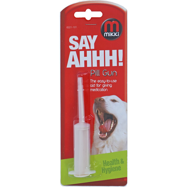 De Mikki pill gun is een simpele en zeer effectieve manier om pillen en capsules aan uw hond, kat of andere kleine huisdieren toe te dienen. Vul de spuit met een beetje water (om het doorslikken te vergemakkelijken) en plaats de pil in de daarvoor gemaakte houder. Houd de bek van uw huisdier open en schiet de pil in de keel van uw huisdier. Wanneer nodig, houd de kaken gesloten en wrijf over de keel om het slikken aan te moedigen.