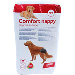 De Comfort Nappy is een super absorberende pamper die kan worden gebruikt door onzindelijke puppy's, loopse teven, nerveuze en incontinente honden. De Comfort Nappy helpt te vermijden dat de puppy of de hond het tapijt, vloer, sofa, …. bevuilt. De pamper biedt een optimale bescherming dankzij de super absorberende gel die bloed of urine absorbeert, met als resultaat dat de pamper droog is binnen enkele seconden. De hond houdt het droog en is vrij van irritaties of infecties. De pamper is zwart gekleurd langs de buitenzijde met als voordeel dat er niks kan doorschijnen. De pamper moet worden vervangen wanneer deze bevuild is en moet bij het huishoudelijke afval worden gegooid. De pampers zijn beschikbaar in 7 verschillende afmetingen, gelieve de omtrek van de hondenbuik op te meten om de correcte grootte van de pamper te kunnen kiezen.